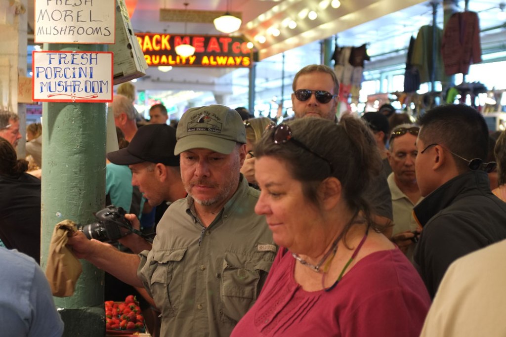 I don’t do street photography very often. It’s something that I find extremely intimidating. I do not search confrontation with anyone, but by pointing my camera in someone’s face I feel it would lead to just that, confrontation. So when visiting Seattle’s Pike Place Market last year, I thought that diving into a crowded place where every second person is holding some sort of camera, I wouldn’t stand out very much. I felt relatively safe pointing my camera here and there, took pictures of the merchandise, the architecture, but also of people around me. Very quickly I realized that nobody really paid much attention to me, since they all assumed I just was a snap-happy tourist, and they let me be. Well, until I took a picture of a pair of shoppers admiring the vegetables… through the viewfinder I saw this guy, staring at me through his dark glasses. He looked really grumpy. Pissed off, even. I felt like my cover was blown, and incredibly embarrassed. Quickly dropping the camera in my bag I started walking away, trying to disappear in the crowd. But every time I looked behind me, there he was, a few steps back, still following me. And closing in. I panicked. I would have ran, if there would have been the room to run… too many people, too big a crowd. When I finally felt a hand on my shoulder, I knew it was him.